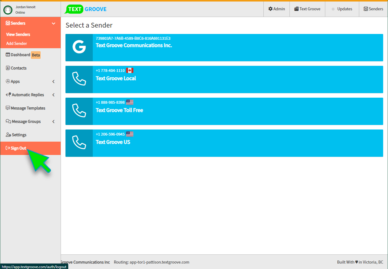 From any window in Text Groove you can access the Left Side Menu, to sign out, simply hover over the left hand menu and click sign out at the bottom of the list. You will be asked again with a prompt, if you are sure you would like to sign out, you can click “Sign Out” or “Cancel”.